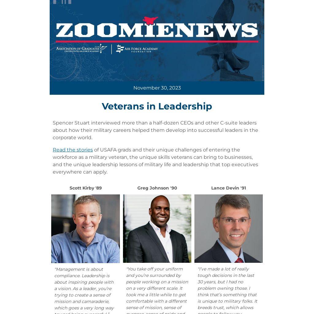 Read the stories of USAFA grads and their unique challenges of entering the workforce as a military veteran, the unique skills veterans can bring to businesses, and the unique leadership lessons of military life and leadership that top executives everywhere can apply.